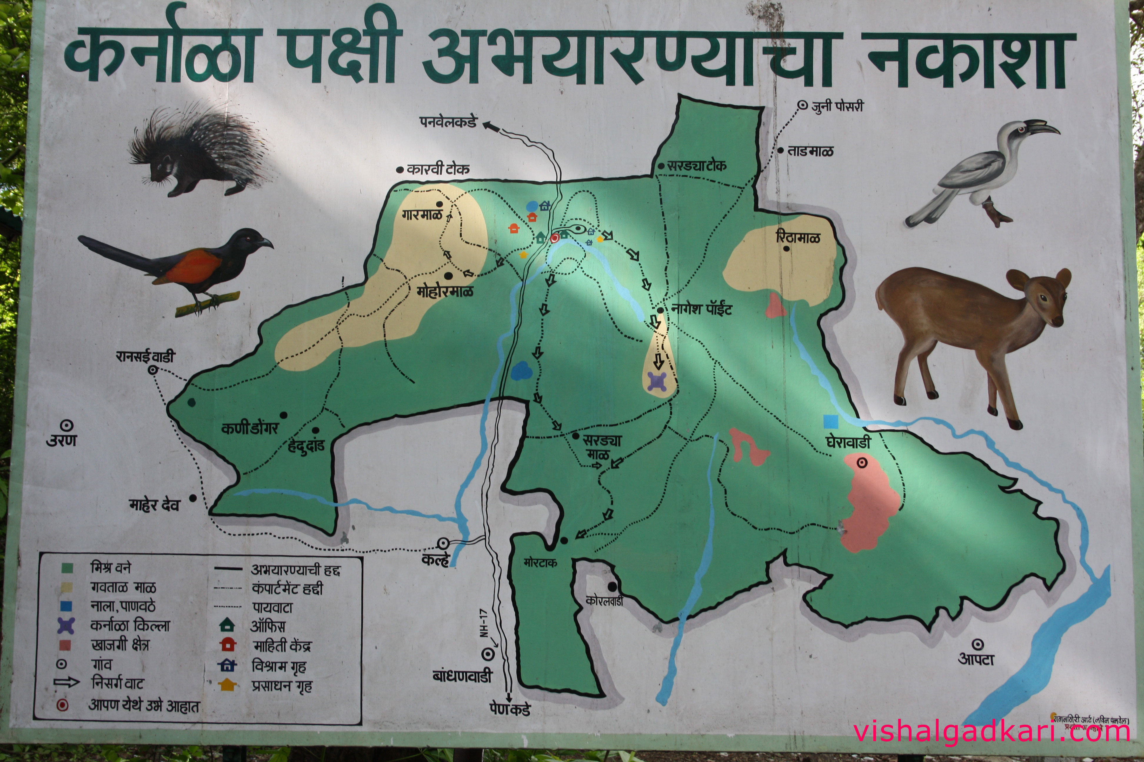 By Car : From Panvel you can take the right turn on to NH17. After Palaspe Fata and Shirdun the entrance to karnala comes up to your left down 10 kms.
